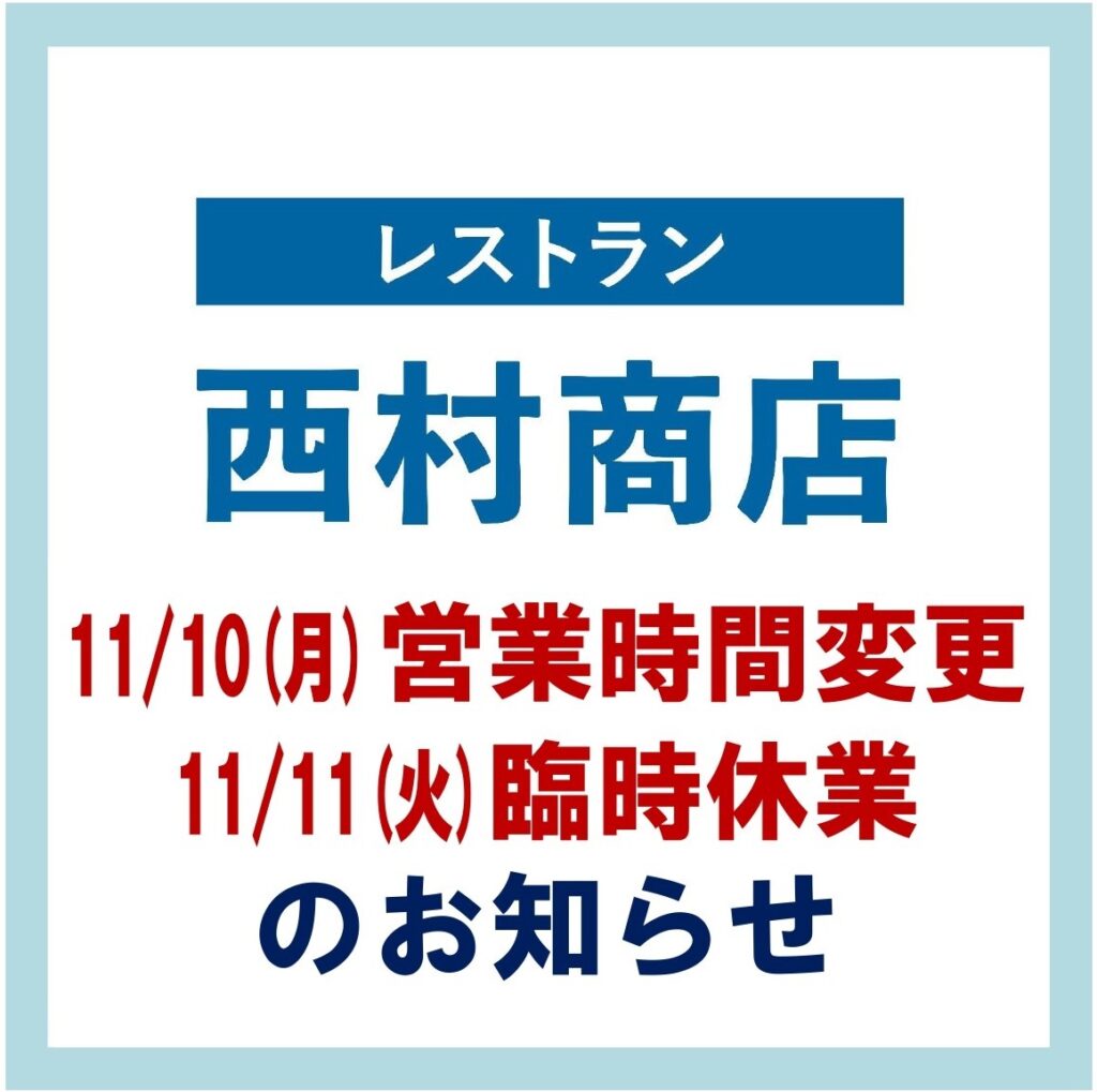 西村商店(レストラン)は、諸般の事情により以下の通り、営業時間変更・臨時休業いたします。