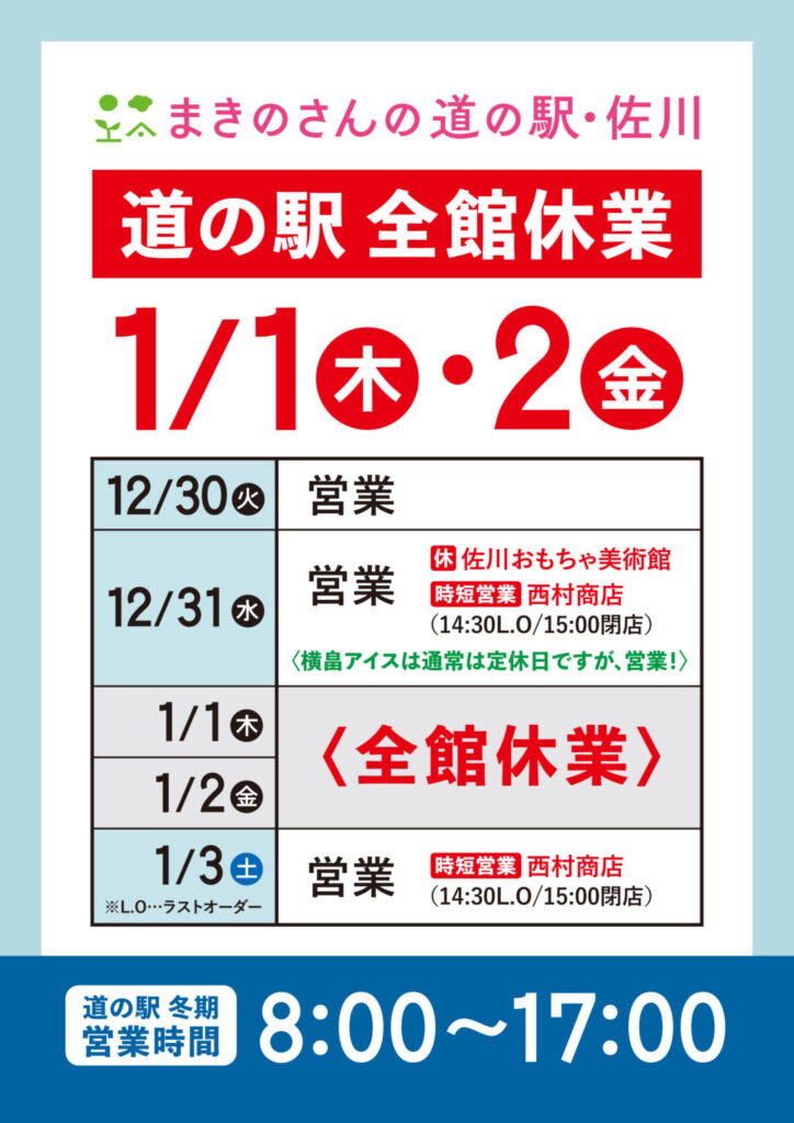 〈年末年始 道の駅全館休業日〉2026年1月1日(木)、2日(金)