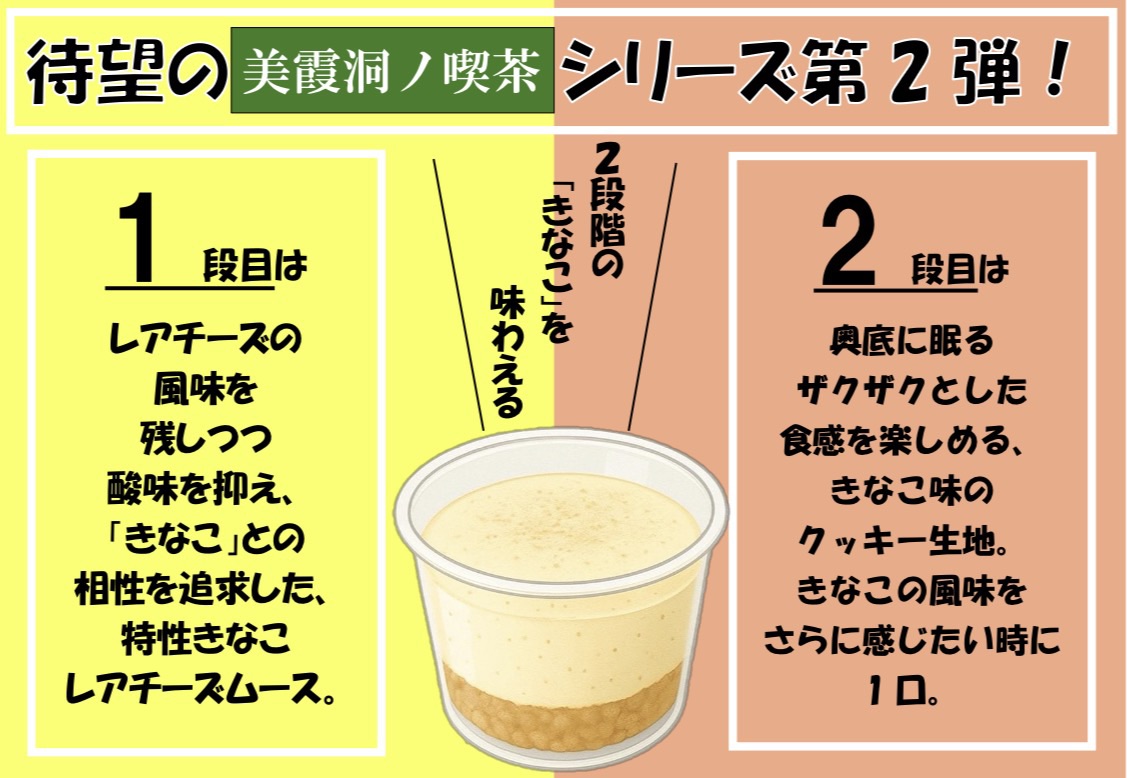 美霞洞ノ喫茶シリーズ第2弾商品 「きなこのレアチーズムースケーキ」です。 お持ち帰り専用の冷凍ケーキになります。 新しい和風レアチーズムースケーキをご賞味あれ。 販売開始 2025/12/1~
