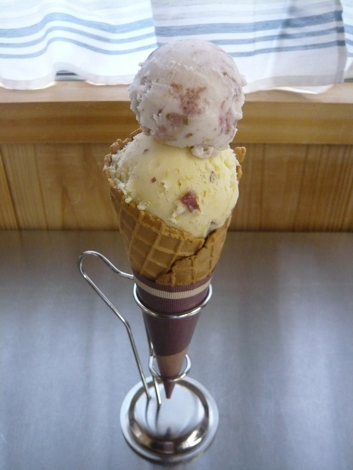 産直コーナー「旬の市」生産者の季節のフルーツを使用したジェラートが常時14種類以上。なると金時、すだち、れんこん、ワカメなど鳴門ならではのご当地ジェラートが人気です。